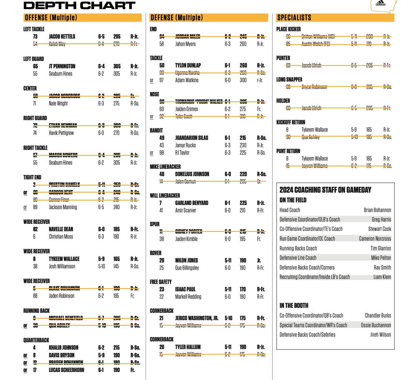 Kennesaw’s QB situation and overall offensive catastrophe in 2024 makes it almost impossible to evaluate the current receiver room. Mack pulled Gabe Benyard and Destun Thomas back from the portal, and he’ll learn a ton about the rest of the group before the next transfer window. If the season started today, you’d pencil in Benyard as a starter, playing the Squirrel White role, with Christian Moss and JD Robinson outside.