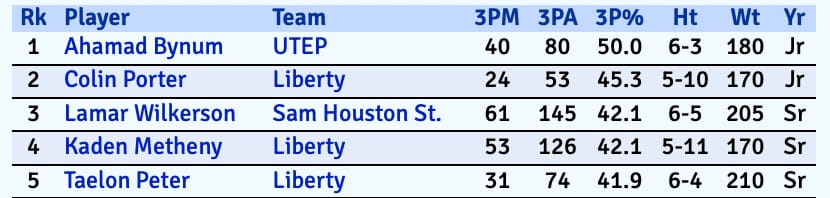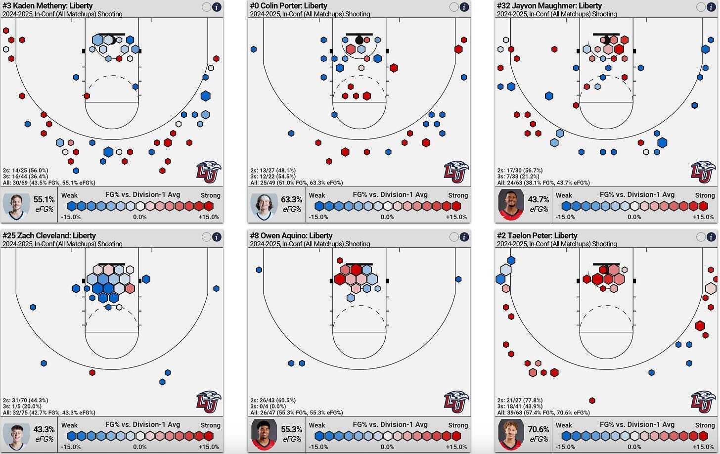Among CUSA teams, only the Owls shoot more threes than Liberty. The main difference is a pretty big one: the Flames make them 10% more often. It’s extremely funny that McKay replaced Darius McGhee with a guy - Kaden Metheny - who shoots even better from deep and looks like Zach Bryan. Talk about a coach who understands what the Liberty fanbase wants. All three of Metheny, Colin Porter, and Taelon Peter rank in CUSA’s top five shooters from distance.