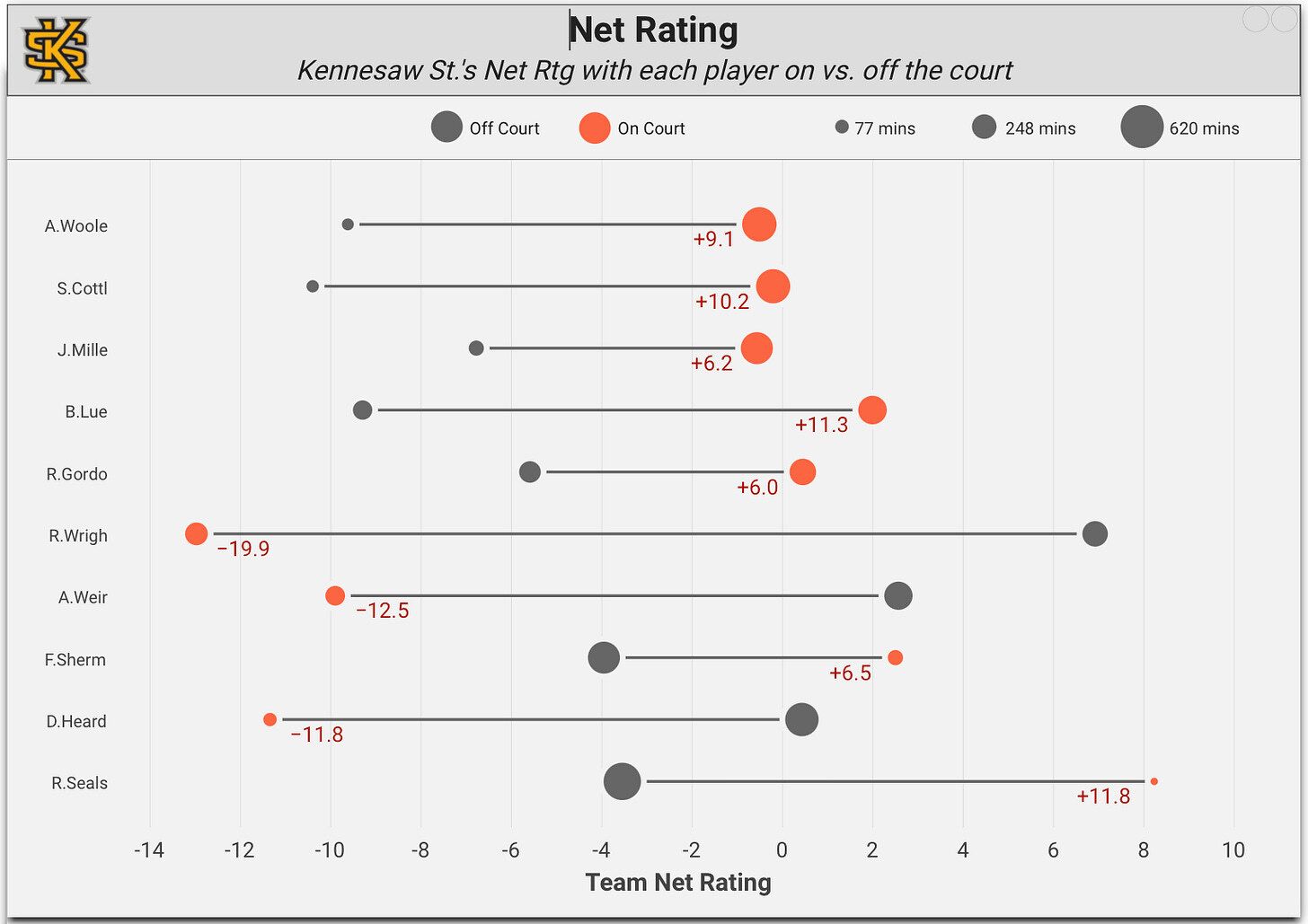 Given his classmate’s league-wide and national recognition, Lue has somewhat quietly put himself into a Big 3 with Cottle and Wooley in terms of overall value and shot volume. Looking at Kennesaw’s own on/off numbers, only Seals in limited duty provides a bigger boost during his minutes: