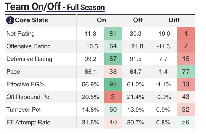 Liberty’s Net Rating is 19 points better with Cleveland off the court, even though he plays around three-fourths of their minutes with the limited depth. Opponents shoot 13% better eFG with him out there and turn the ball over a lot less frequently. The rest of the numbers: