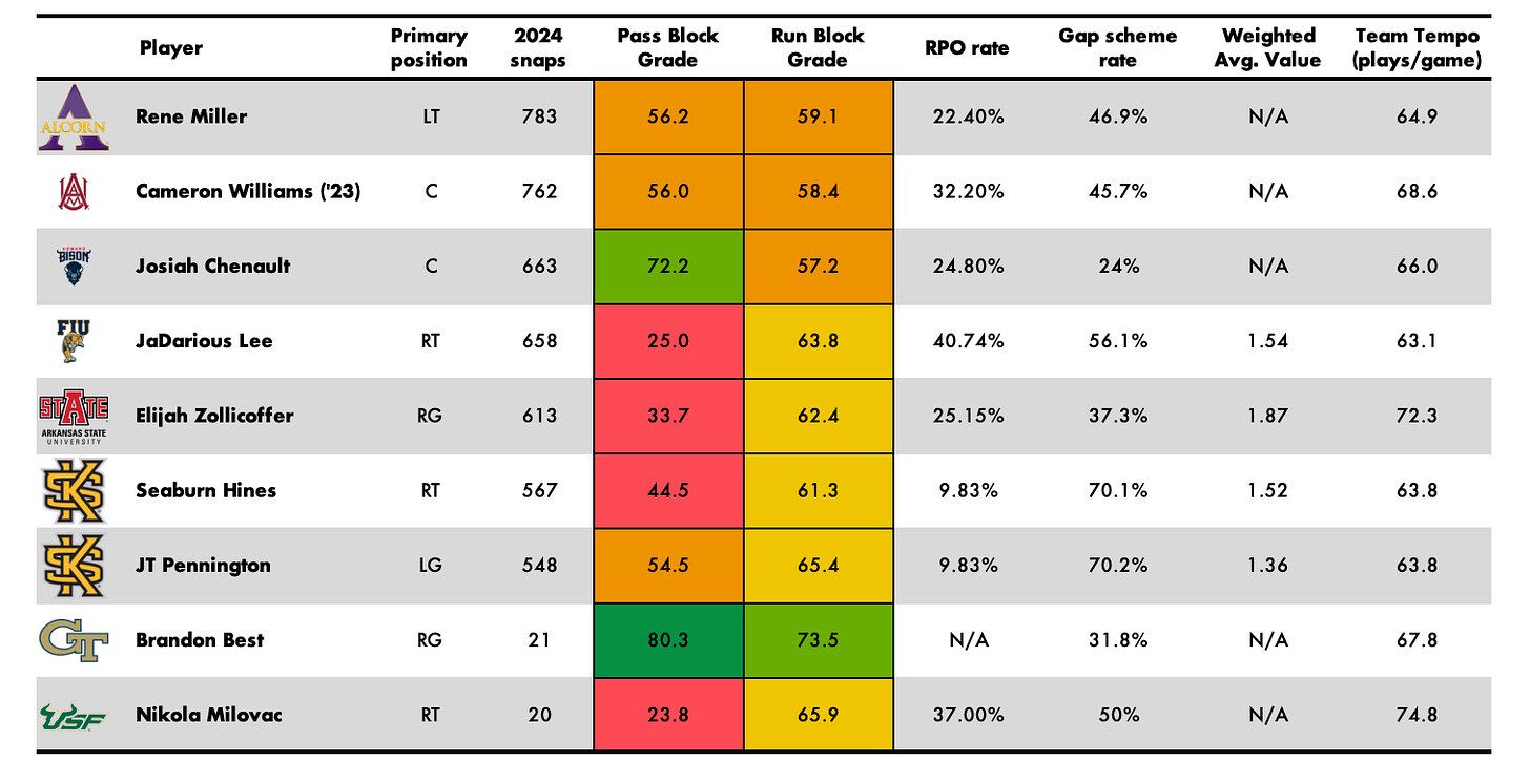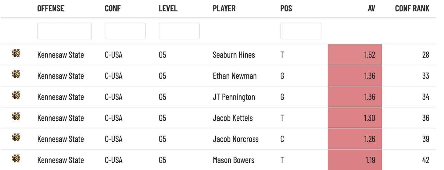 Speaking to that weak-link idea, here’s how the Owls linemen fared at their respective schools last season. Tempo, RPO rate, etc. are obviously not quality indicators, but that’s included for extra context as to how their previous style fits in with what Kennesaw will do on offense this year.
