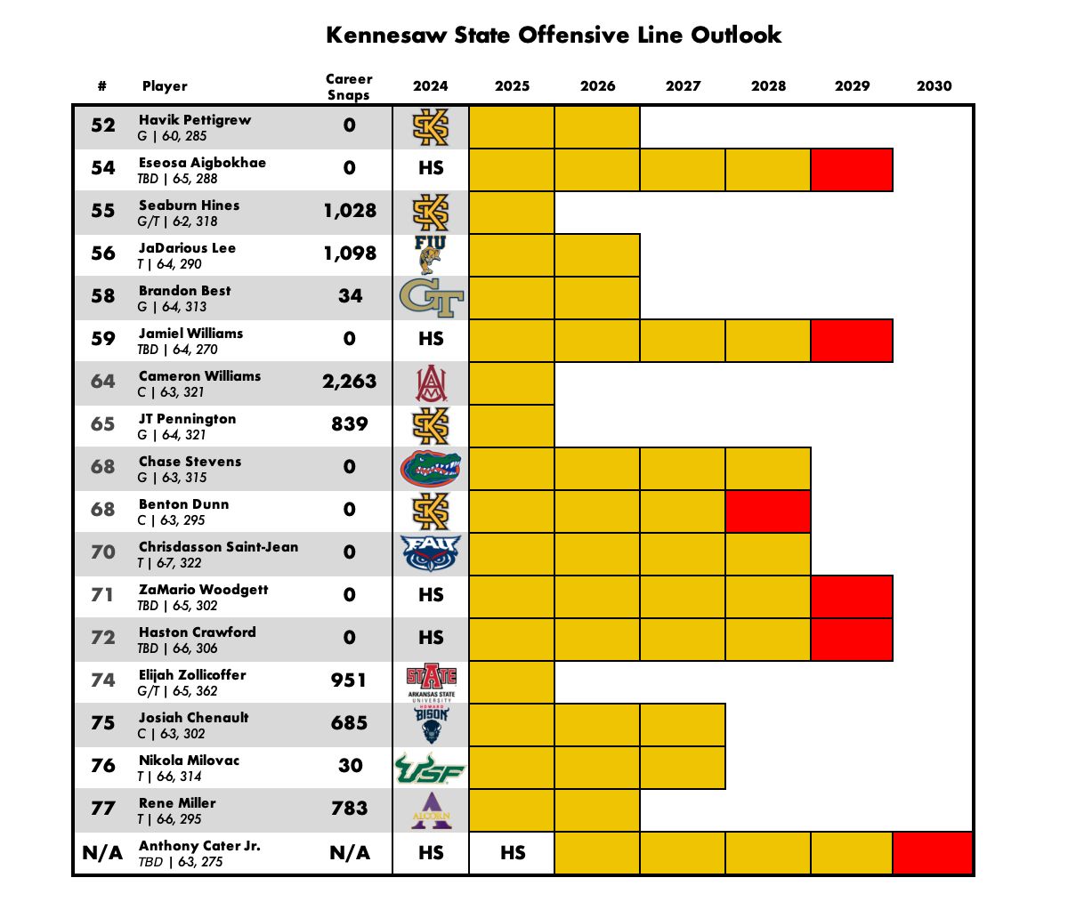 For a full 30,000-foot view on the state of the offensive line room with an eye on the future, I started to put together these charts on current experience and the long-term prognosis at a couple positions. Yes, I’m aware of how pointless it is to even mention 2030 in an era where college football rosters are built four months at a time.