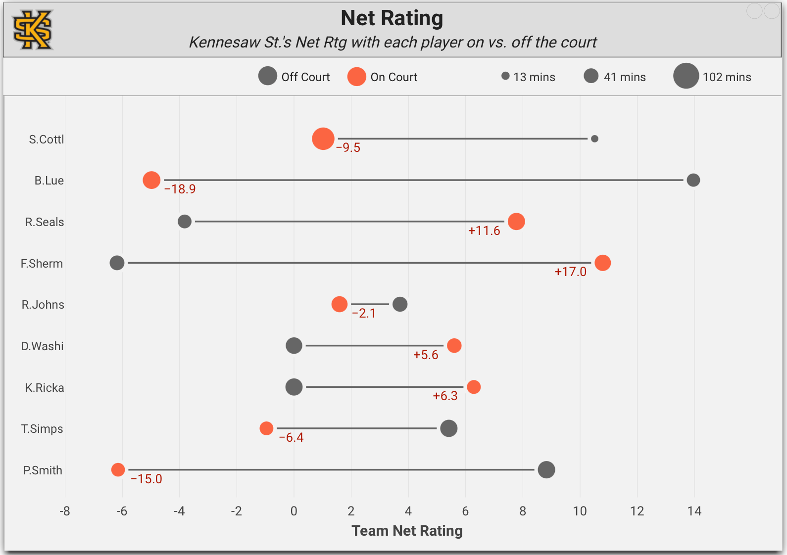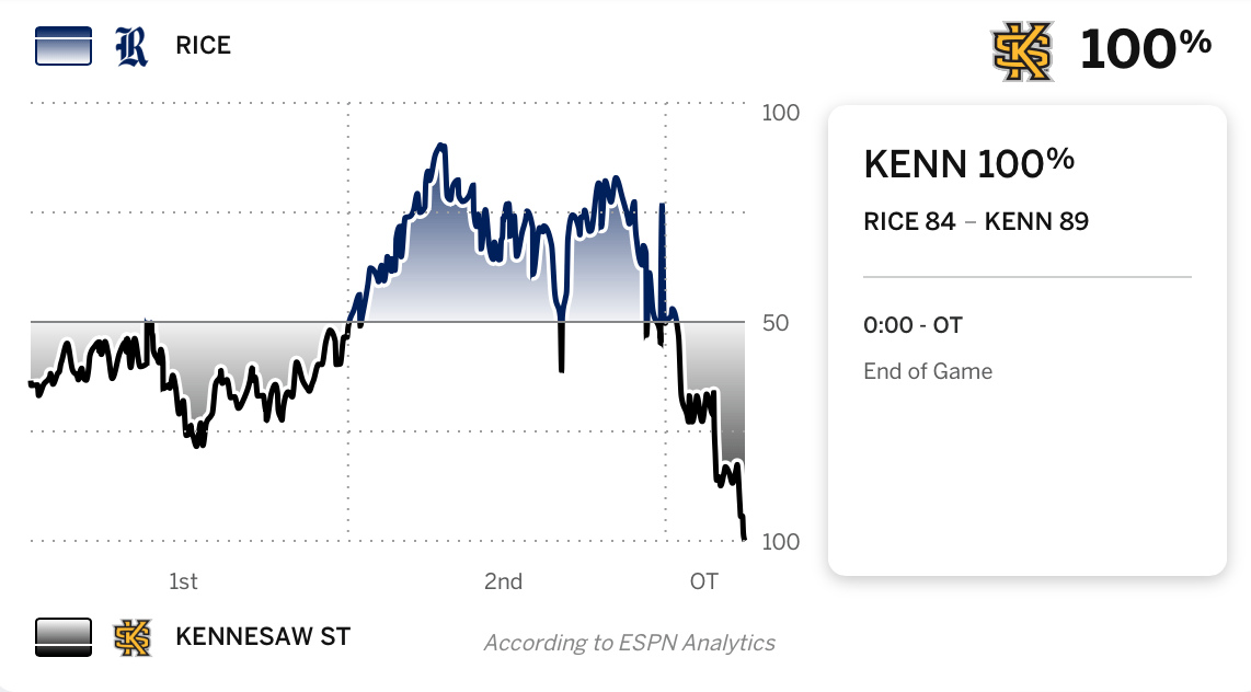 Rice shot 47.4% at the rim (within 4.5 feet). Rob Lanier’s squad entered the tourney in the nation’s bottom-five in both paint points and 2P FG%. Rice got a small bump in 2P% on Monday, mostly thanks to some tough midrange jumpers from a team that does not appear to study the same shot selection analytics as Pettway’s OatsBall. Otherwise, KSU handled business and did not allow a bad interior scoring team to have a get right game. Seven blocked shots for Kennesaw doesn’t hurt, either.