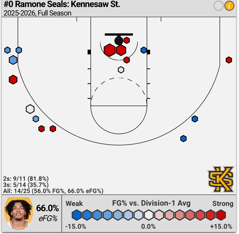73.2% true shooting for Ramone Seals. If Monday’s version of Seals is even halfway sustainable, that’s an absolute game-changer for KSU. Tracking his true shooting number has been a pet project of mine this season and one of the most important report card metrics for the Owls this year. Why True Shooting? That includes FT results, so it captures Seals’ ability to draw fouls - a trait that was there last season, even during some performances where he was otherwise MIA - and convert at the line. Seals is also up to a 149.9 offensive rating, per KenPom, in the early stages of the season. That would’ve led the ‘24-’25 squad by 30ish points.