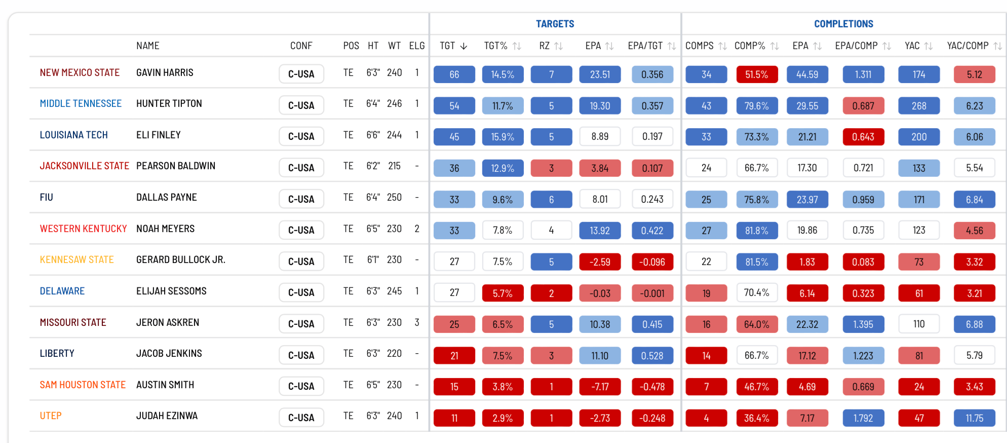 This CUSA TE leaderboard from CFB Graphs speaks to the gap between consistency and production: Bullock was middle of the pack in share, catches, and only 3 tenths off the lead in completion percentage, but dead last in EPA/reception and air yards per completion. You could count on Bullock to catch the ball within four yards of the line of scrimmage, run three more yards, then go down. Like clockwork.